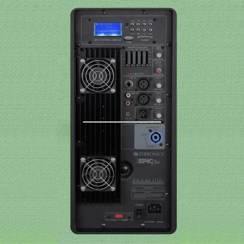 Connectivity - XLR Input, RCA & 6.35 Jack Input, Aux Input. Bluetooth, FM, SD Card, USB Play, Graphic Equilizer, Cooling Fans, Recording Function, Power Supply Port, Volume Controls