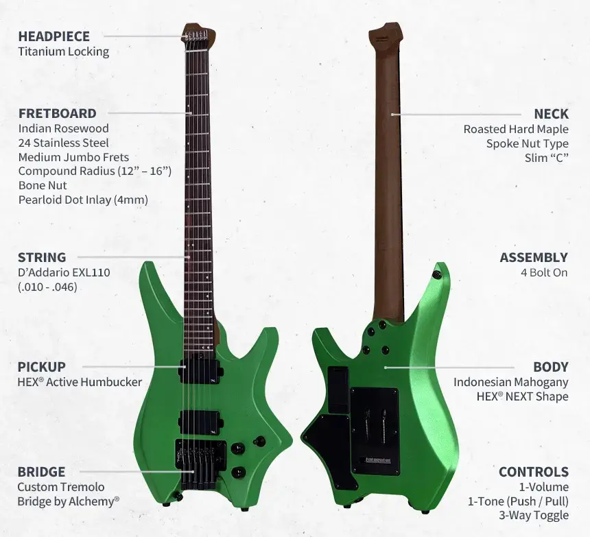 HEX N500/S Headless Electric Guitar BLACK NEXT SERIES STAINLESS STEEL FRETS